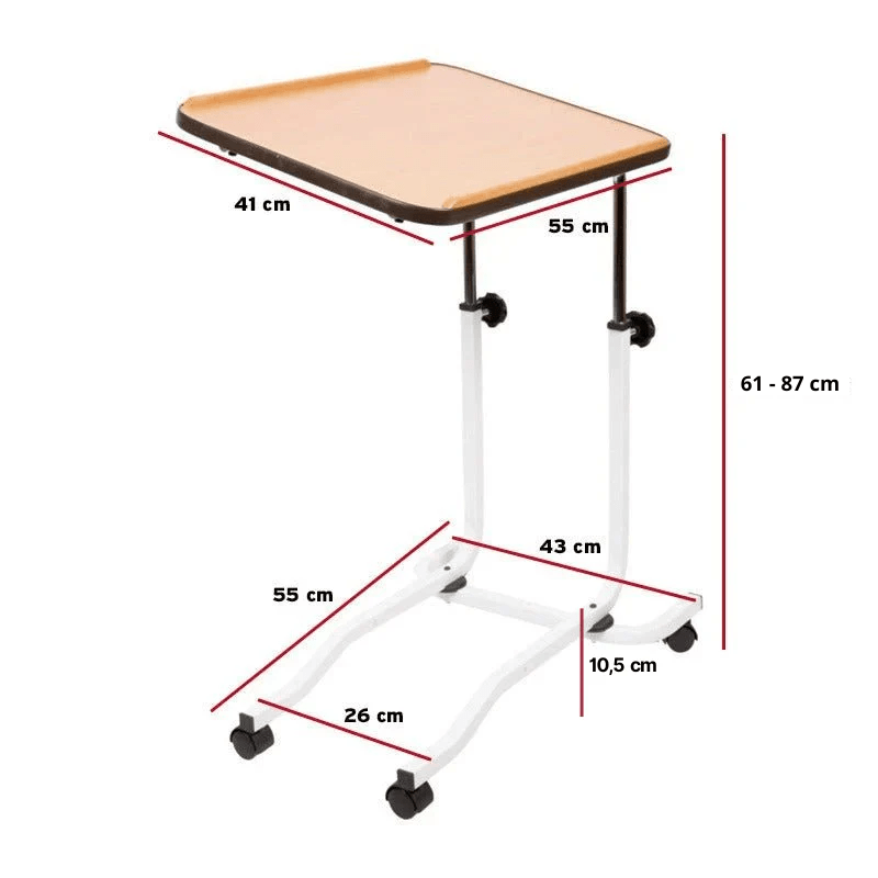 Enkel, allsidig og brukervennlig sengbord med fire hjul, som enkelt kan justeres i høyden og vinkles etter behov.