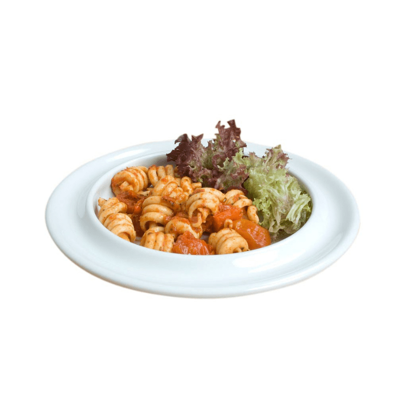 Elegant Steelite porselenstallerken med innvendig kant som gjør det enklere å få maten opp på skjeen eller gaffelen. Dette designet gjør den ideell for personer som kun kan bruke én hånd ved måltider. Den formede kanten gjør det også enkelt å holde og bære tallerkenen.