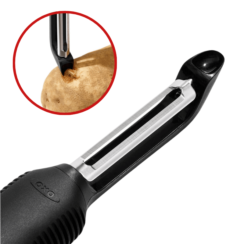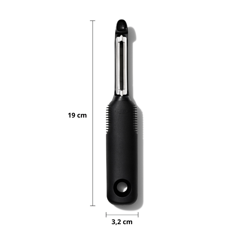 OXO Good Grips Swivel Peeler gør det let at skrælle alt fra kartofler til æbler. De dobbelte rustfri stålklinger følger råvarens form og giver en jævn og hurtig skrælning. Det bløde, skridsikre håndtag ligger sikkert i hånden, og den indbyggede udgraver fjerner nemt små pletter.