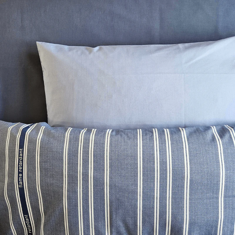 Brandhæmmende lagen i 100% blødt bomuld - farven på lagnet er støvet blå. Dette lagen er specialbehandlet med et selvslukkende materiale, der gør, at lagenet ikke kan antændes.