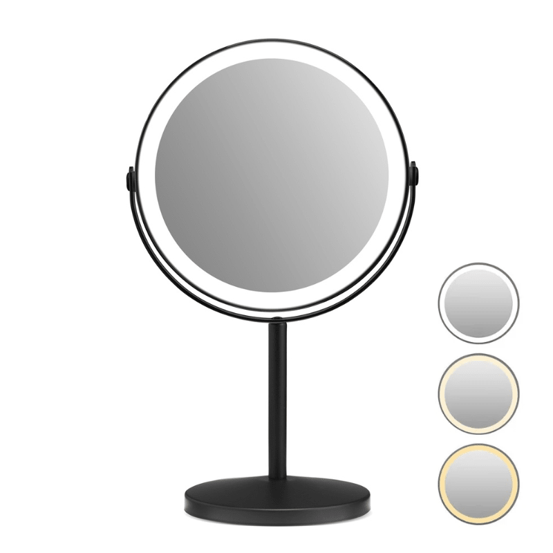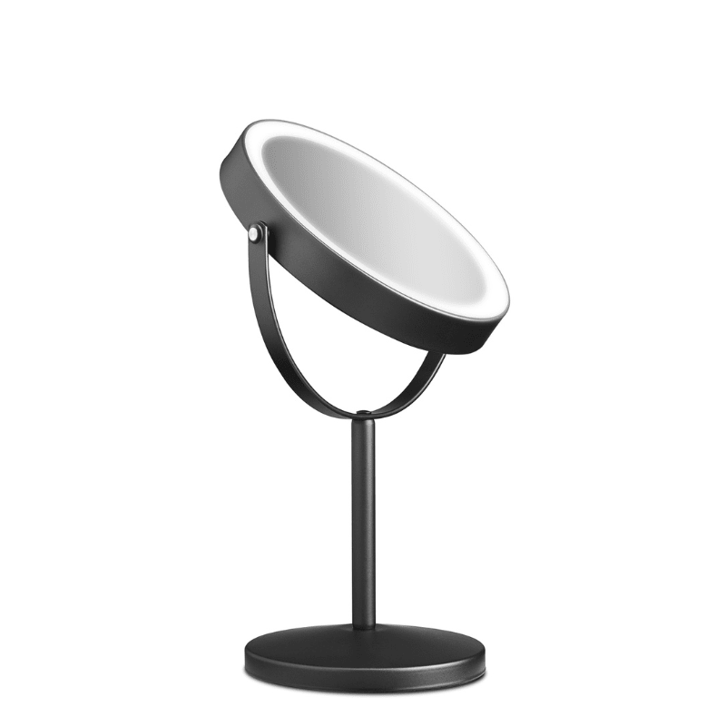 Genopladeligt LED-bordspejl med et kraftigt, integreret LED-lys, der kan indstilles i tre forskellige lysnuancer: varm, neutral og kold. Via en diskret touch-knap på siden styrer du nemt både tænd/sluk, valg af lysfarve og justering af lysstyrken med den indbyggede dæmpningsfunktion.
