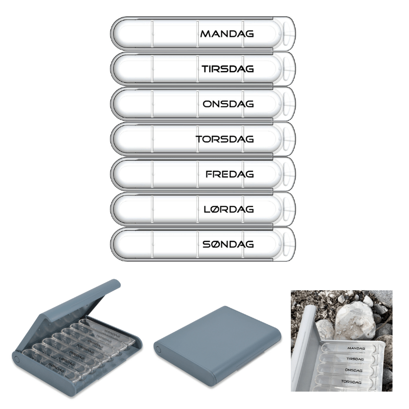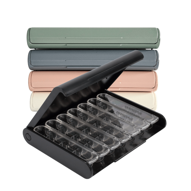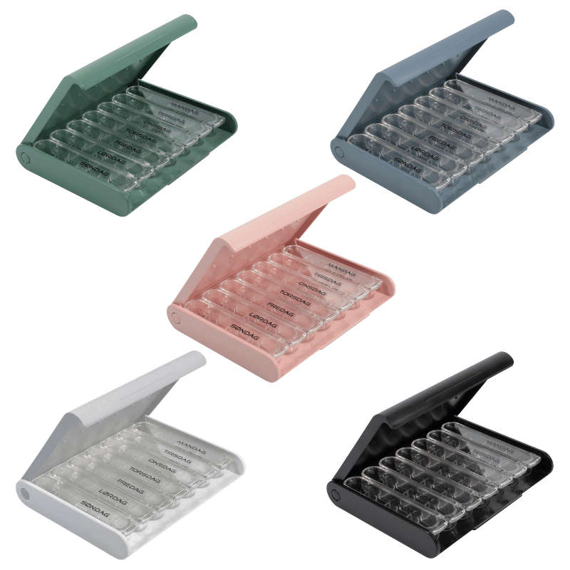 Stilren pilleæske i flotte farver i et enkelt og funktionelt dansk design. Pilleæsken indeholder 7 doseringsæsker - en til hver af ugens dage. Doseringsæskerne er inddelt i 4 rum, hvilket giver mulighed for op til 4 doseringer per dag.