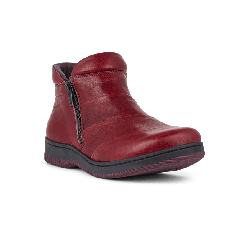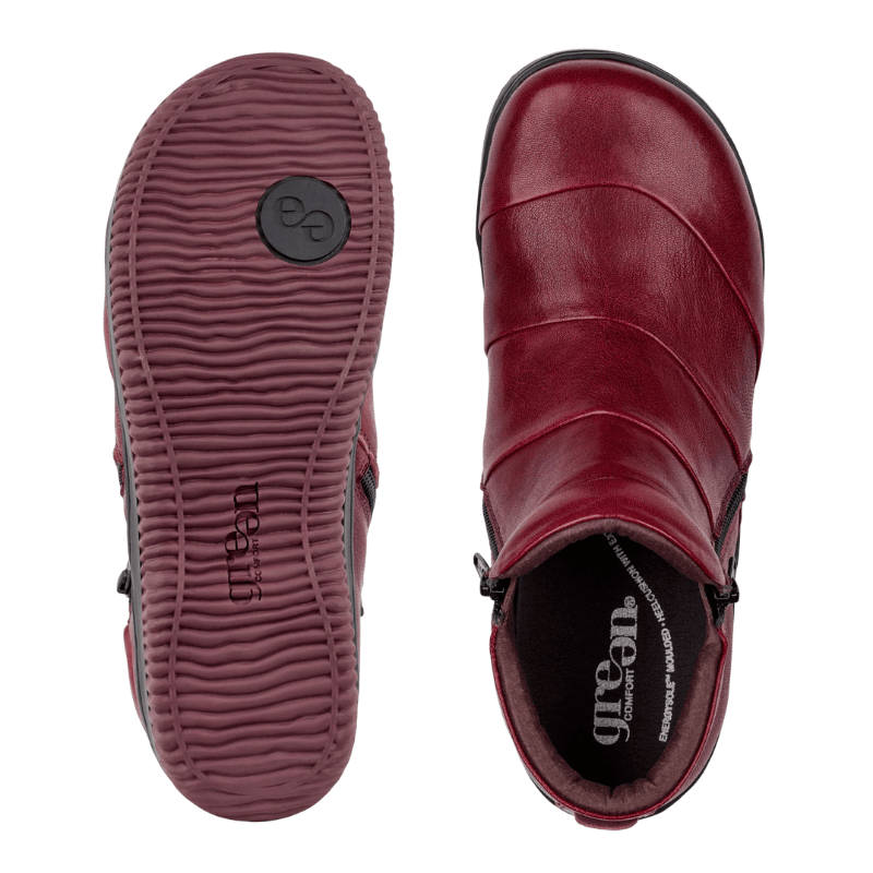 Kort bordeaux-farvet læderstøvle fra Green Comfort med to praktiske lynlåse, som gør den nem at tage af og på, mens de fine syninger giver et moderne og elegant udtryk. Den mønstrede gummisål sikrer dig et godt og sikkert fodfæste – uanset vejr og underlag.