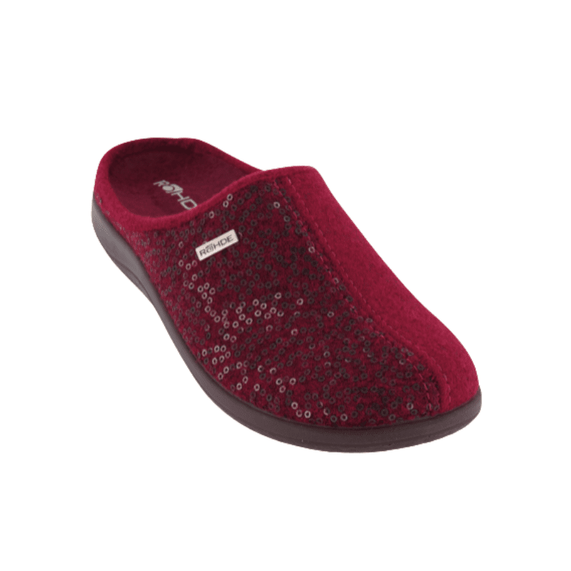 Hjemmeskoen er lige til at stikke i, sidder godt på foden og har en skridsikker ydersål.