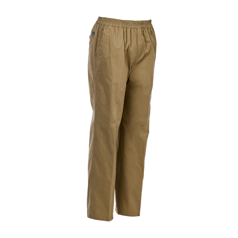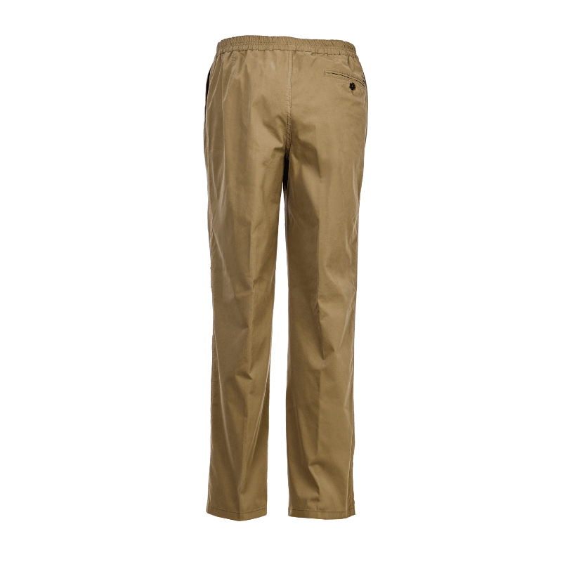 Lette og klassiske beigefargede bukser i mykt stoff fra Brühl, med elastikk i livet – helt uten knapper og glidelås. Buksene har to dype frontlommer og én baklomme med knappelukking.