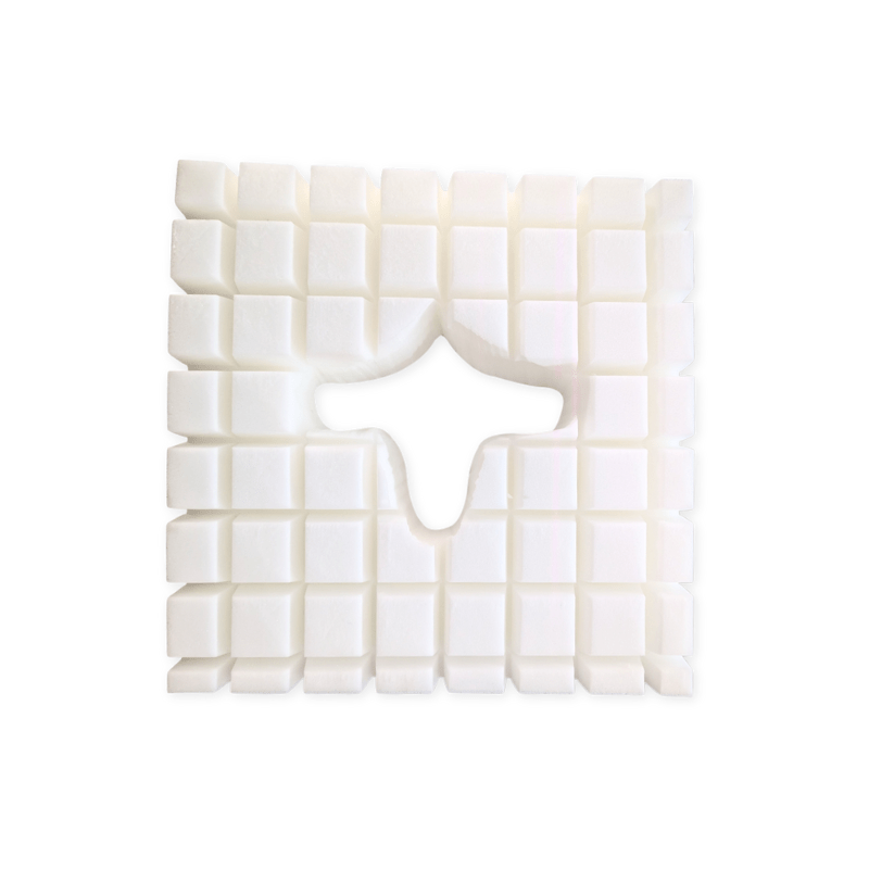 Skummet er delt inn i små kvadrater, noe som sikrer en jevn fordeling av trykket og optimal støtte til kroppen under bruk.
