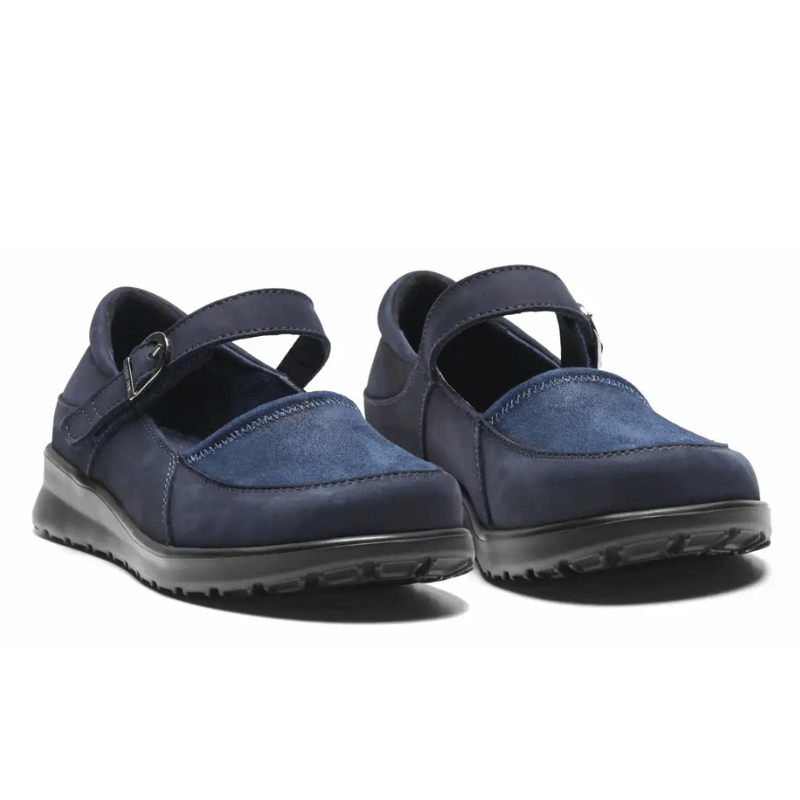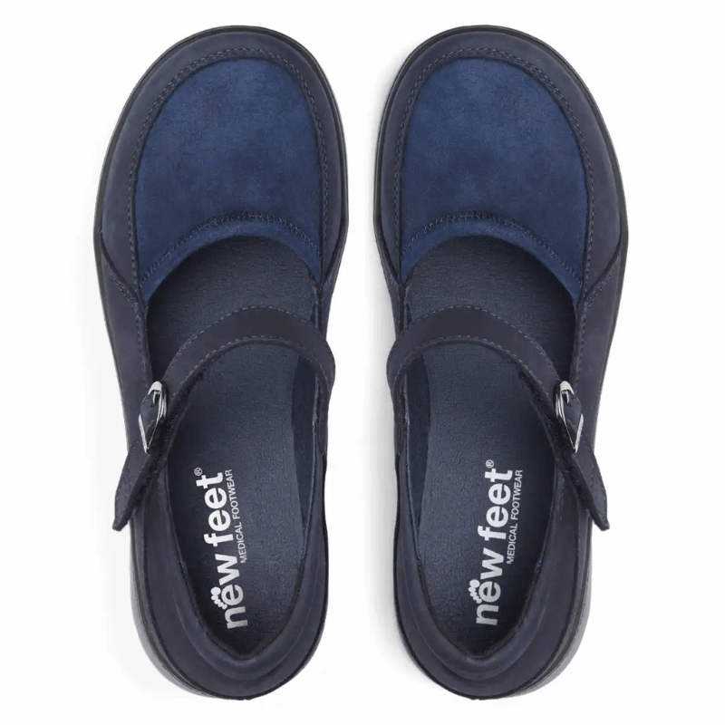 Mørkeblå New Feet ballerina i mykt og naturlig skinn med semskede detaljer, designet for å gi komfort hele dagen. Skoen har et smart lukkesystem med en enkel borrelås over vristen, som lett kan justeres for å oppnå optimal passform.