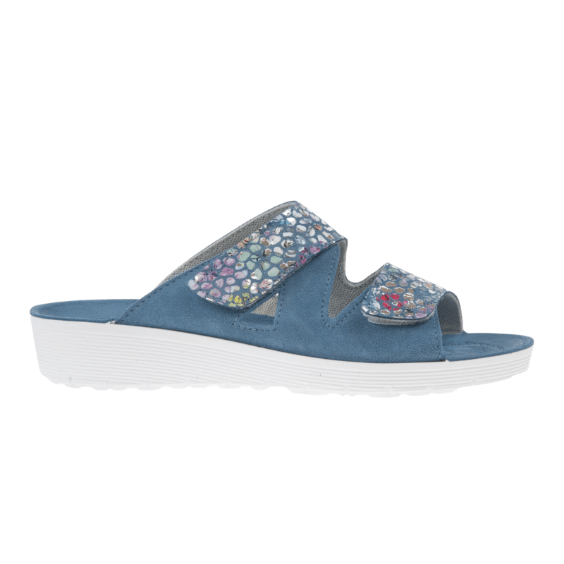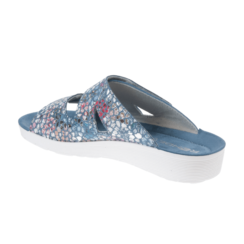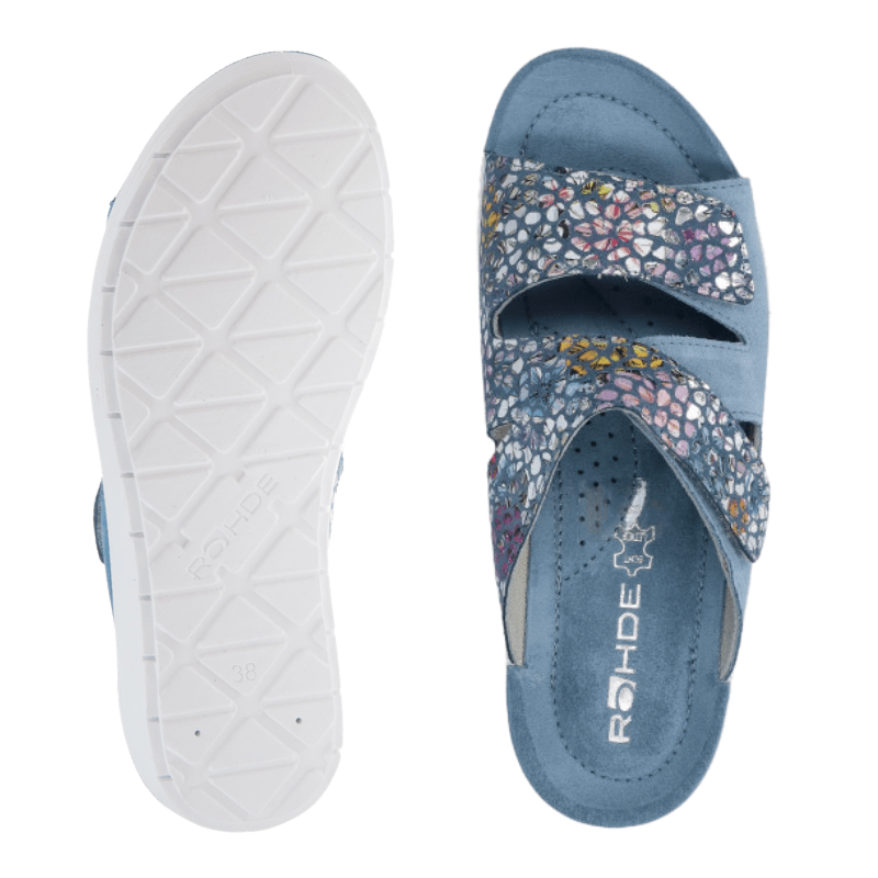 Elegant slip-in sandal fra Rohde i en jeansblå farge med vakre mosaikkdetaljer på remmene.