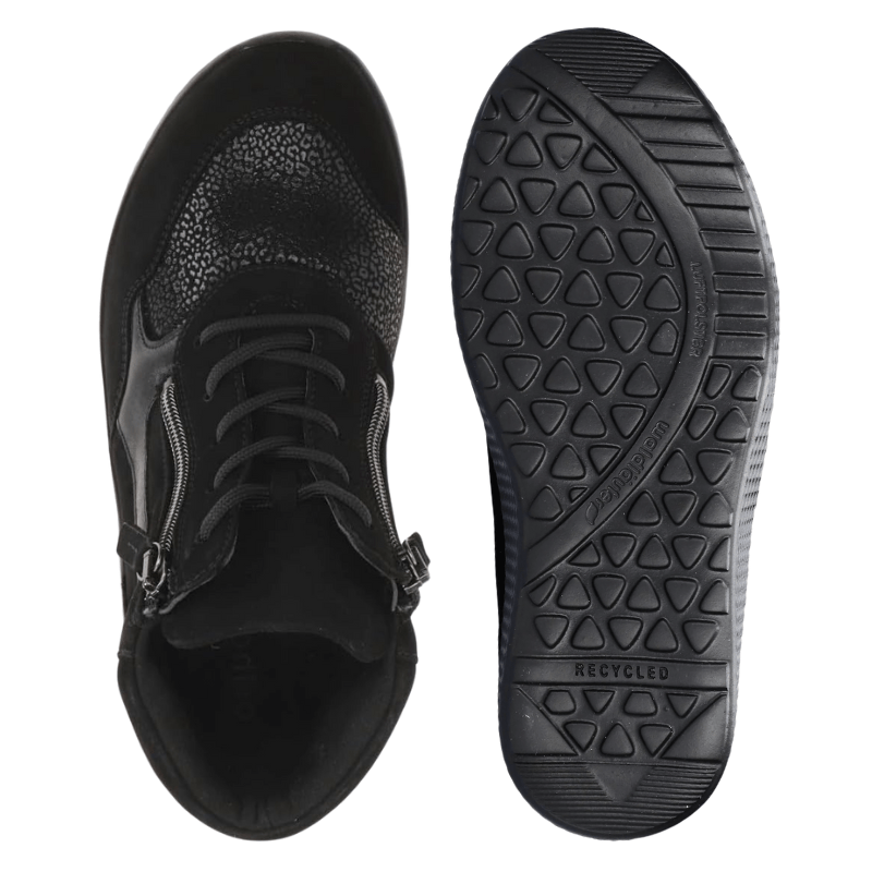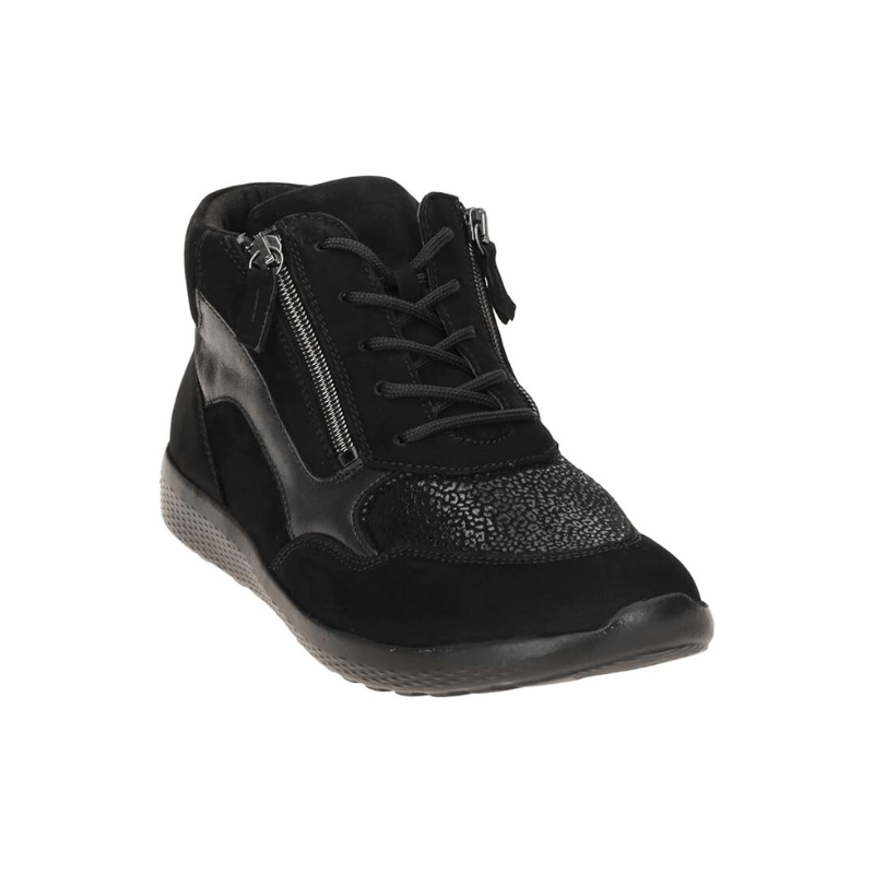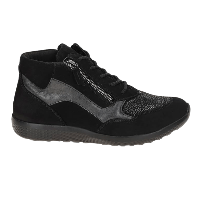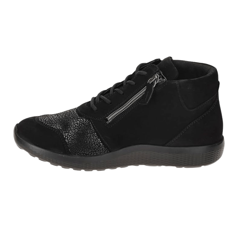 Elegant svart sneaker fra Waldläufer laget i en kombinasjon av skinn og tekstil, noe som gir god pusteevne. Skoen har både lisser og praktisk glidelås i siden, så den er enkel å ta av og på. Den ekstra brede passformen passer perfekt for deg med brede eller følsomme føtter.